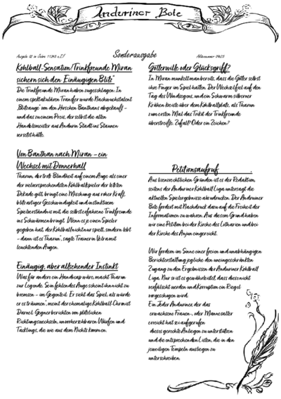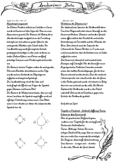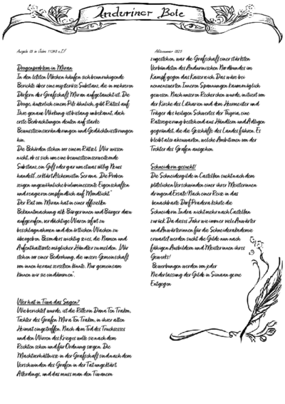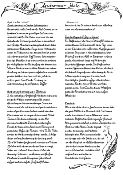 Der Anduriner Bote ist die meist verbreitete Zeitung auf Andurin, herausgegeben in Andurin Stadt. Sie berichtet regelmäßig über die aktuellen gesellschaftlichen und politischen Geschehnisse im Lande. Der Anduriner Bote hat sich nach Ausruf des Kaiserreichs zum Kaiserlichen Boten umbenannt. Eine vertrauenswürdigere Nachrichtenquelle soll die freie, neu gegründete Zeitung "Stimme Andurins" sein.